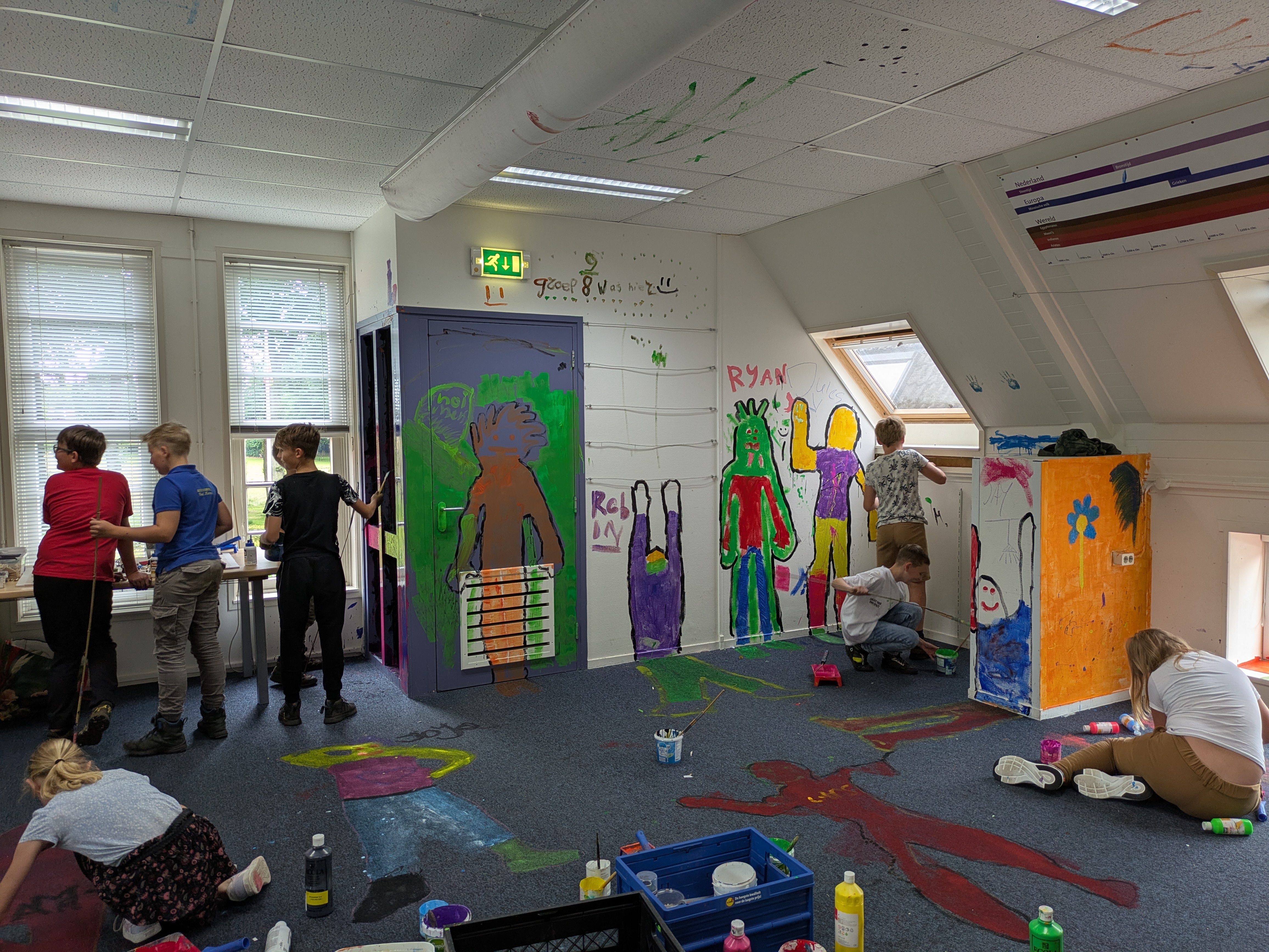De oude school gaat gesloopt worden. Met alle kinderen van de school mogen we het oude pand een mooi afscheid geven. De groepen 7 en 8 schilderen elkaar op muren, vloeren en deuren. Wat een geweldige expositie voor ouders en oud leerlingen van de school.