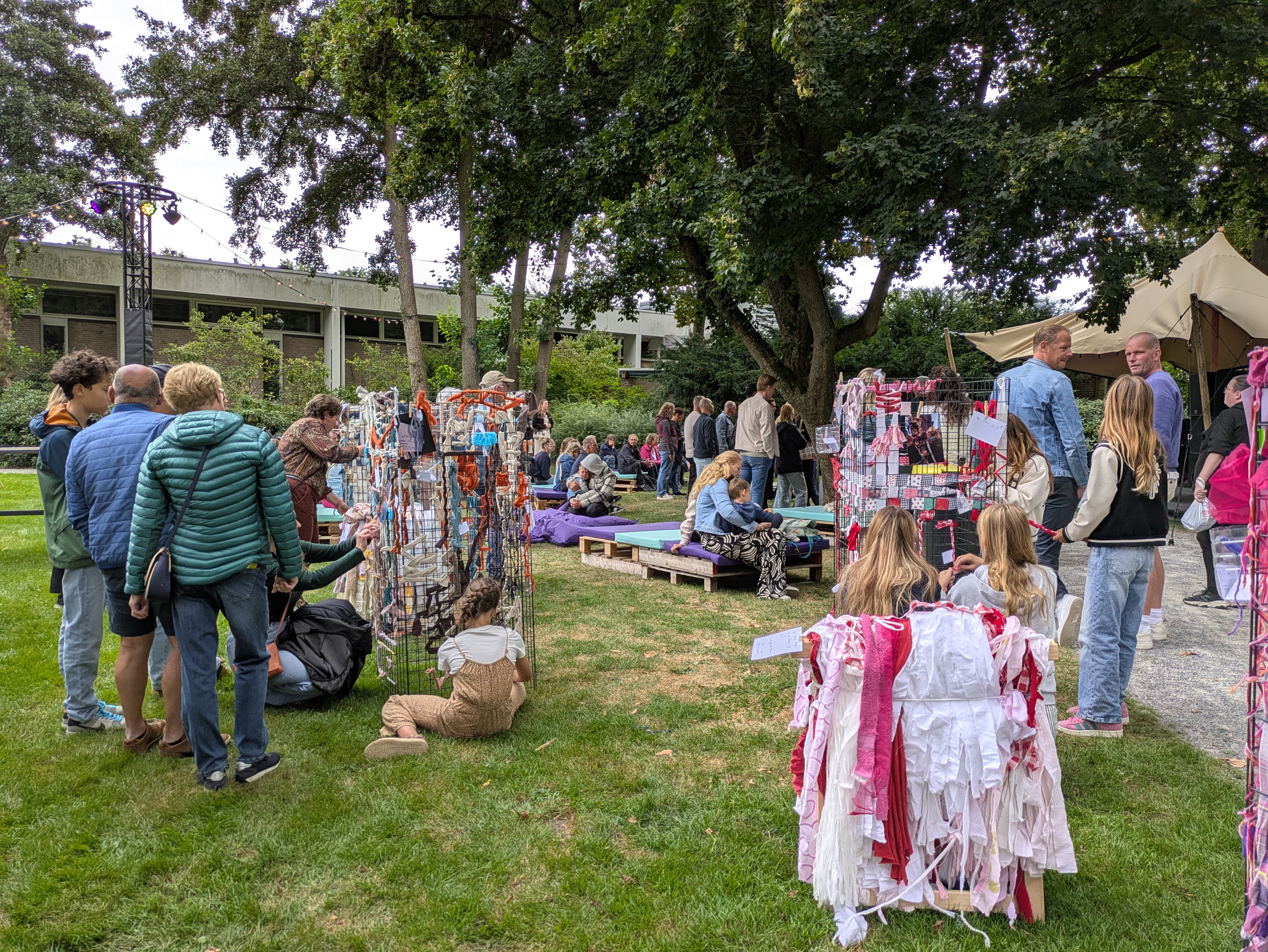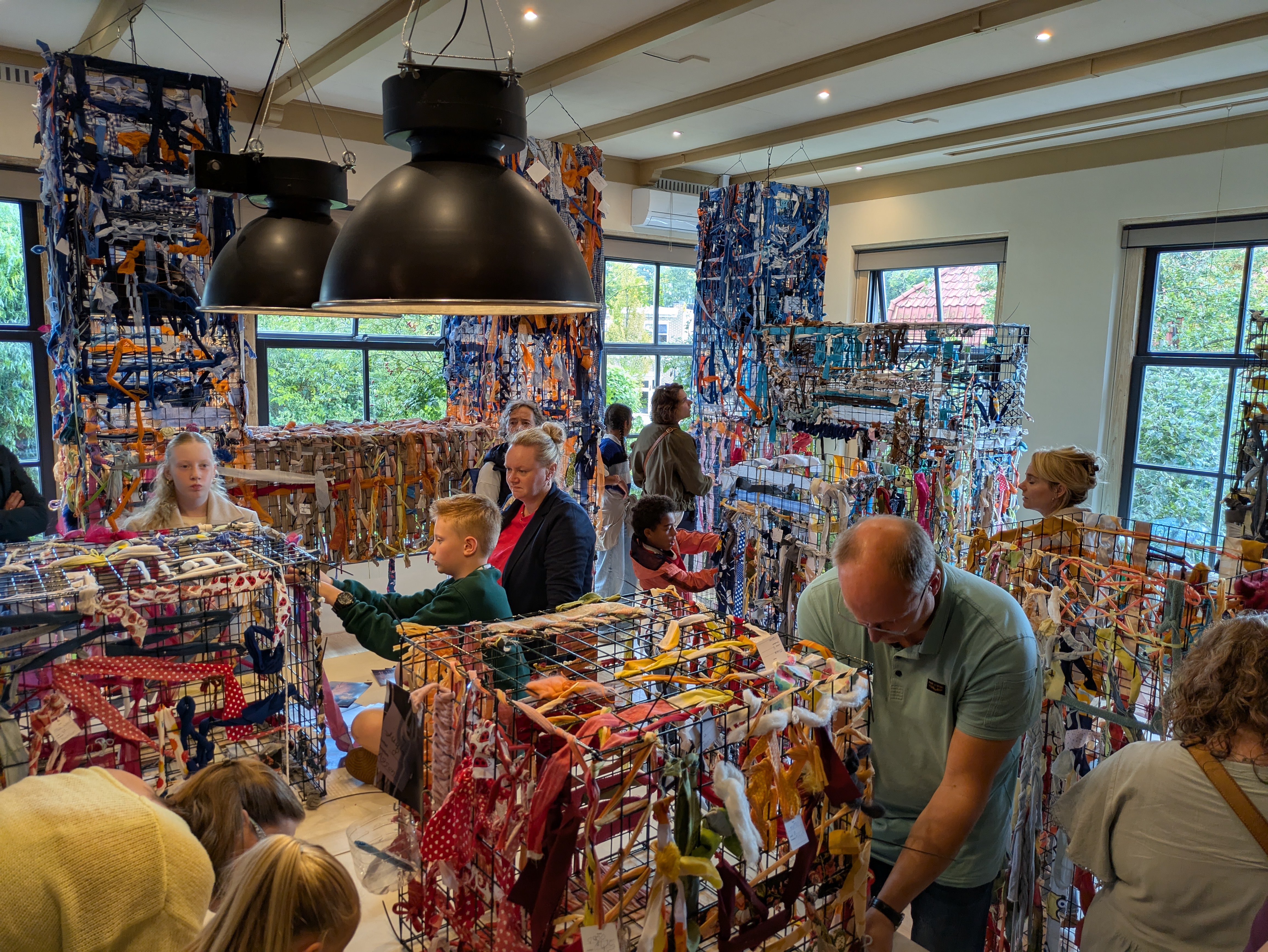 In het atelier van Poldy Koot (Vaart 97) staat een enorm kunstwerk, dit heeft alles te maken met het thema van Kunst aan de Vaart van dit jaar ‘Oorsprong’. Oorsprong gaat voor ons over met elkaar verbonden zijn. Uiteindelijk zijn we allemaal genetisch verbonden en lijken we met al onze verschillende culturen meer op elkaar dan we denken. Met ons educatie en community- project willen we het met elkaar verweven zijn benadrukken en vergroten. Ruim 120 gaasrekken vol geweven met oude repen stof vormen samen een doolhof waar je als bezoeker tussendoor kunt lopen en verder aan kunt weven.