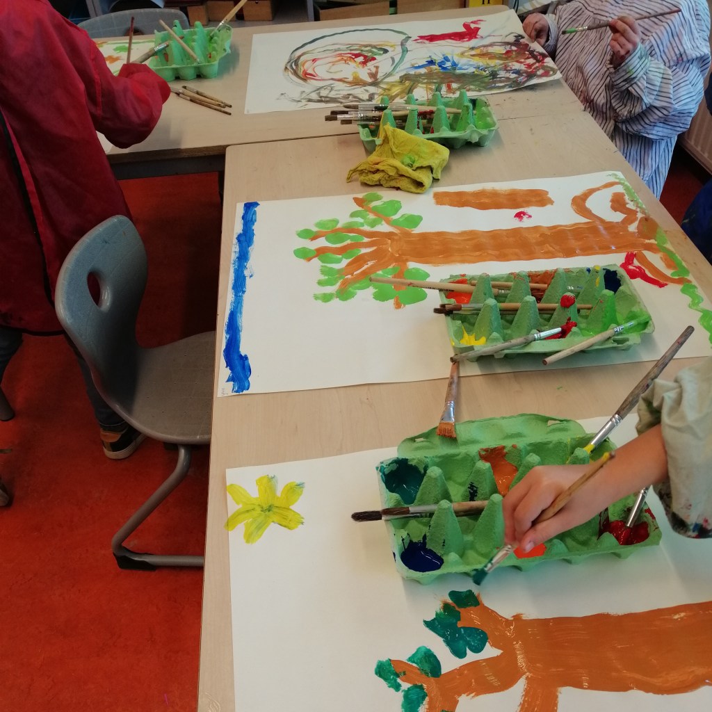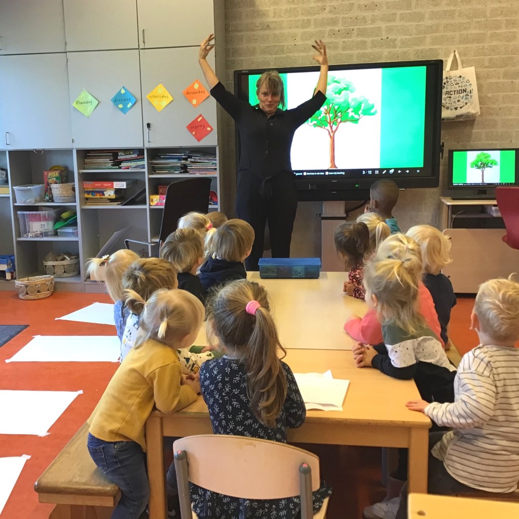 Bij de peuters en kleuters bomen tekenen of schilderen. Eerst een verhaal over bomen en daarna zelf aan de slag.