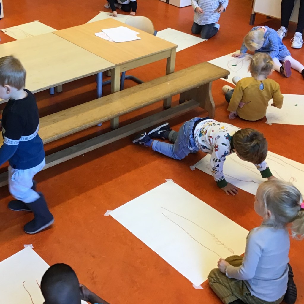 15 peuters tekenen bomen op grote vellen op de grond. Van mooie krassen en rondjes tot strakke bomen alles gaat vol enthousiasme en concentratie.